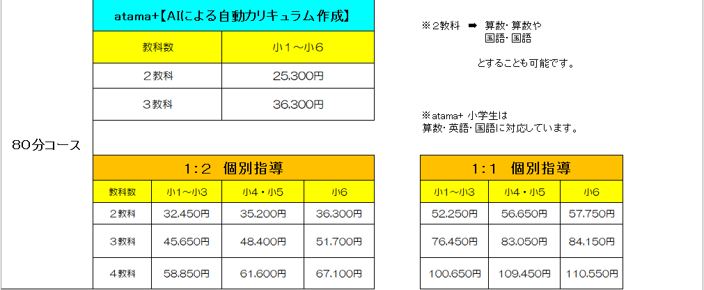 例えば小学生が80分授業コースをatama+受講として選択されて、算数と国語の2教科で通塾した場合は、