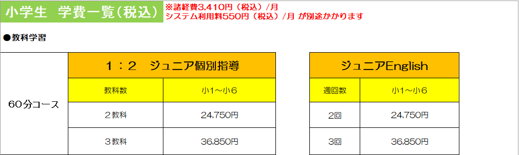 例えば小学生がジュニアコースを選択されて、算数と国語の2教科で通塾した場合は、