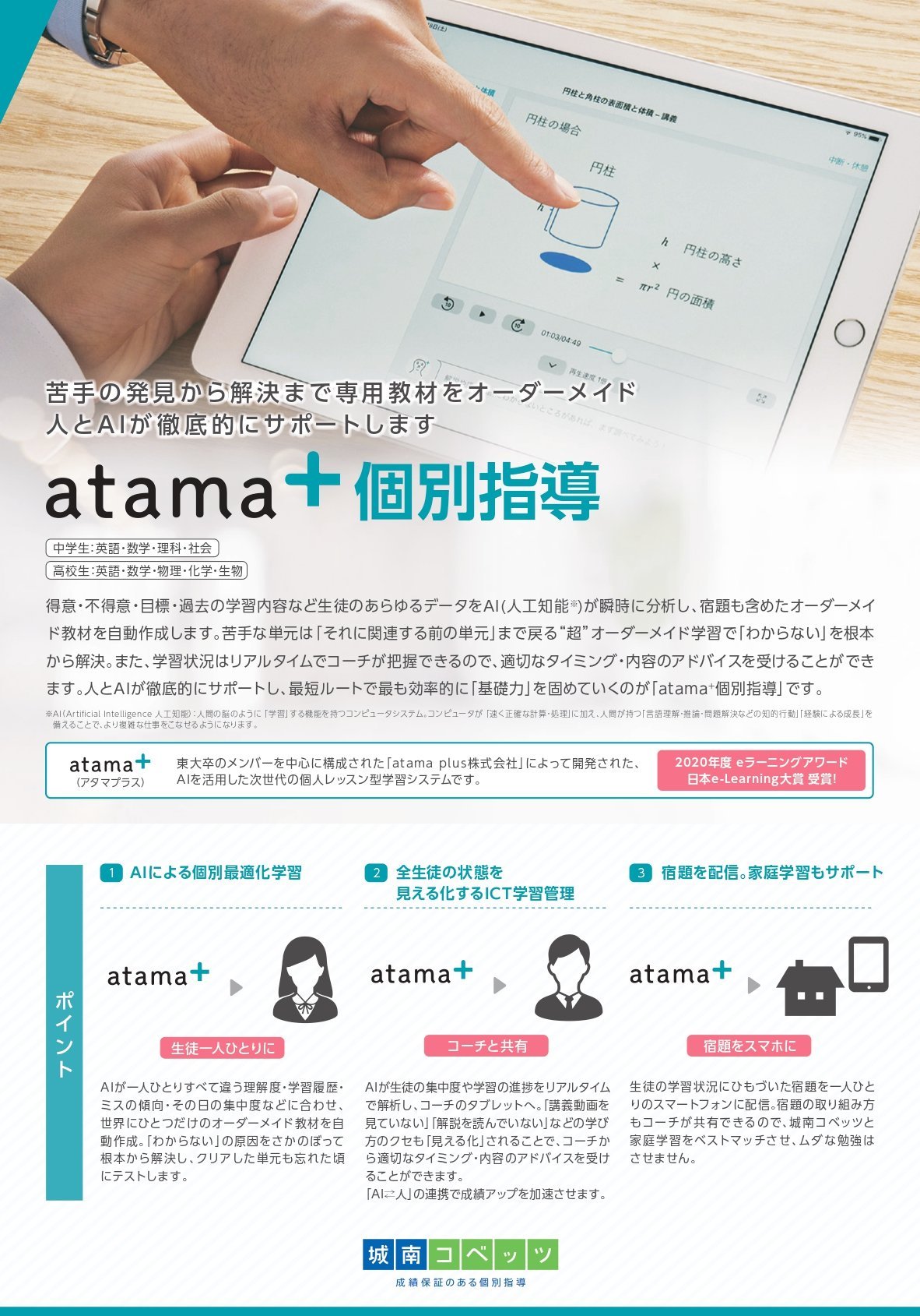 城南コベッツでは自習スペースがあり勉強に集中できた。またエアコンなどもあり快適に勉強する事ができた。授業では講師は優しくとても分かりやすかった。atama+では自分のペースに合って学習できた。