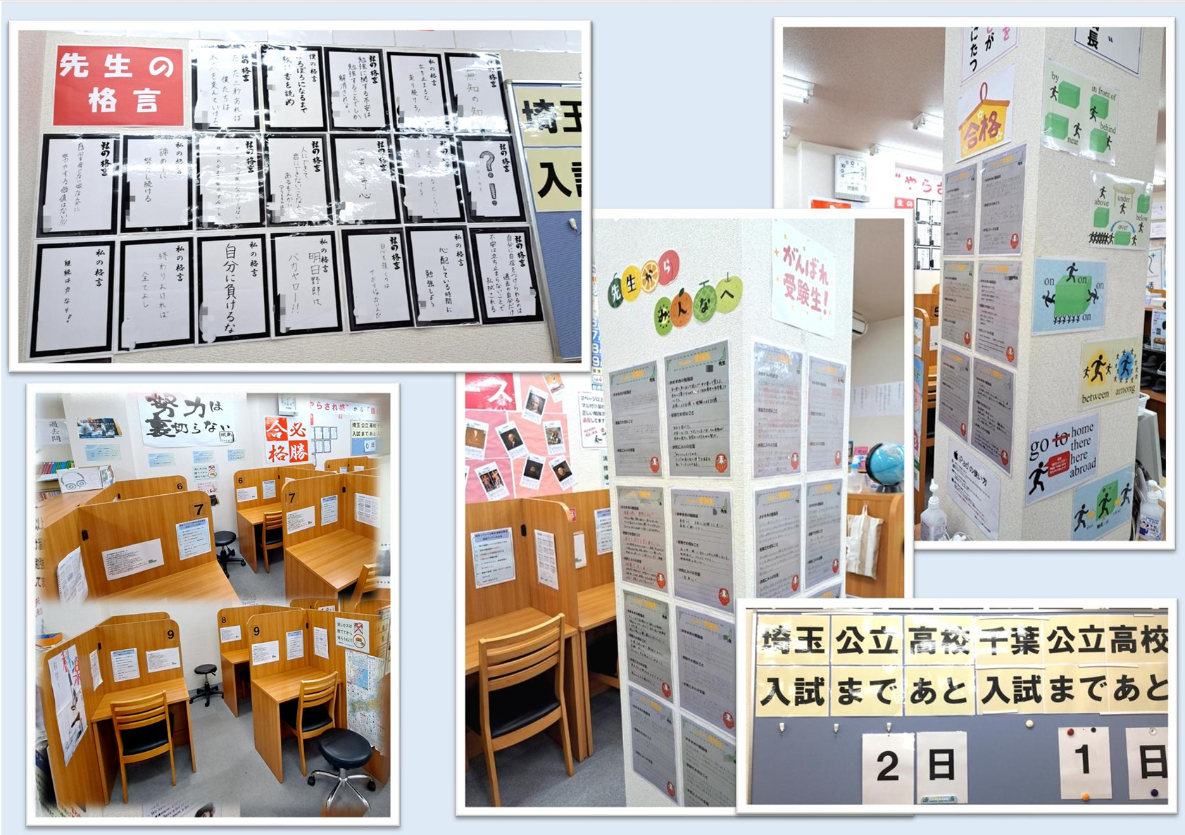 塾の中の様子!授業ブースは個別に分けられています!その他、モチベーションを上げるための掲示物や、ぬいぐるみを置いたりしながら「ストレスフリー」で勉強ができるように工夫しています。ぜひ一度ご来校ください♪