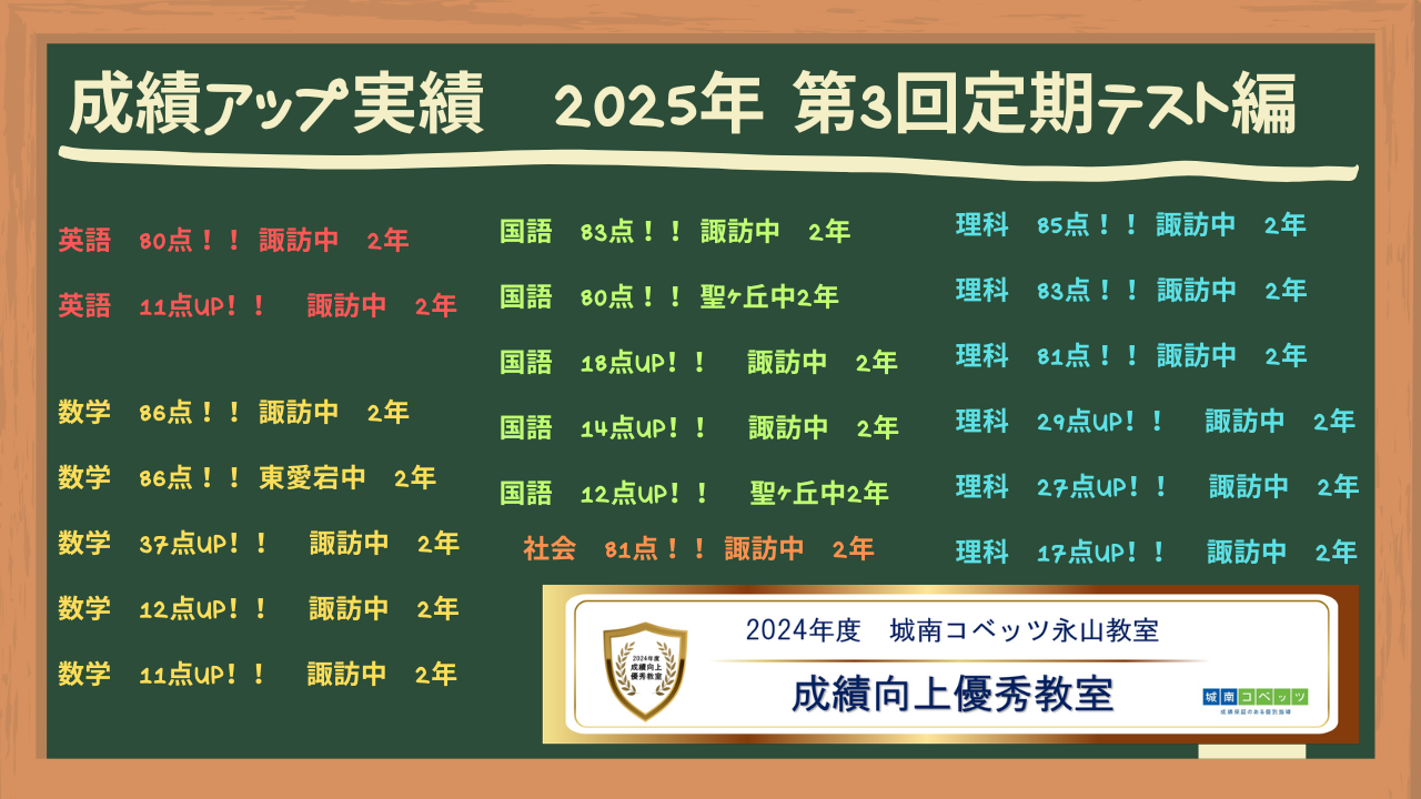 上がった理由は、初めてこんなにたくさん勉強したこと、わからない問題を城南コベッツ永山教室の先生がわかり易く、そしてわかるようになるまで教えてくれたことです。とても良かったと思います!!次はさらに全教科80点以上を目指します!!