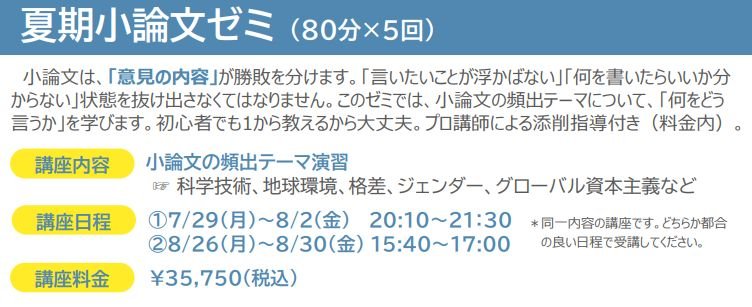「夏期小論文ゼミ」と「夏期文章表現トレーニングゼミ」のセット受講ですが、分けることもできます。