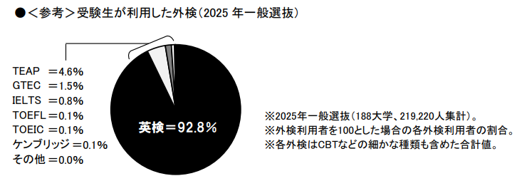2025年度一般選抜のデータでは、外検利用者のうち92.8%が英検を使用しており、