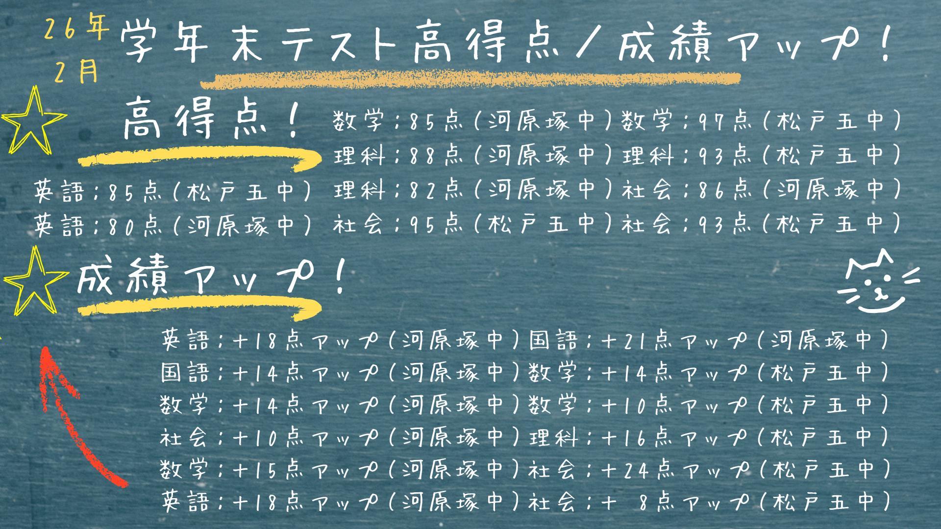 国語の論述問題が苦手だったのですが、塾で読む練習・書く練習を細かく指導してもらったおかげで入試と定期テストで解答をしっかり書けたと思います。