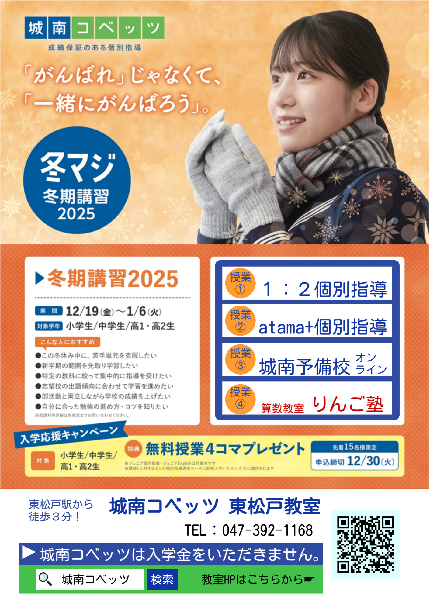 復習や冬休みの課題のサポート、冬休み明けの予習から受験対策まで、城南コベッツ東松戸教室にぜひご相談ください。