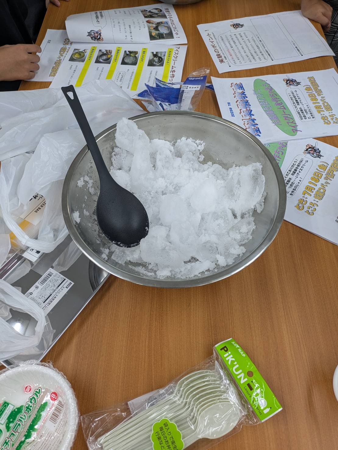 そこに塩を混ぜると、氷の溶けるスピードが速くなり、急激にまわりの温度を下げていきます。