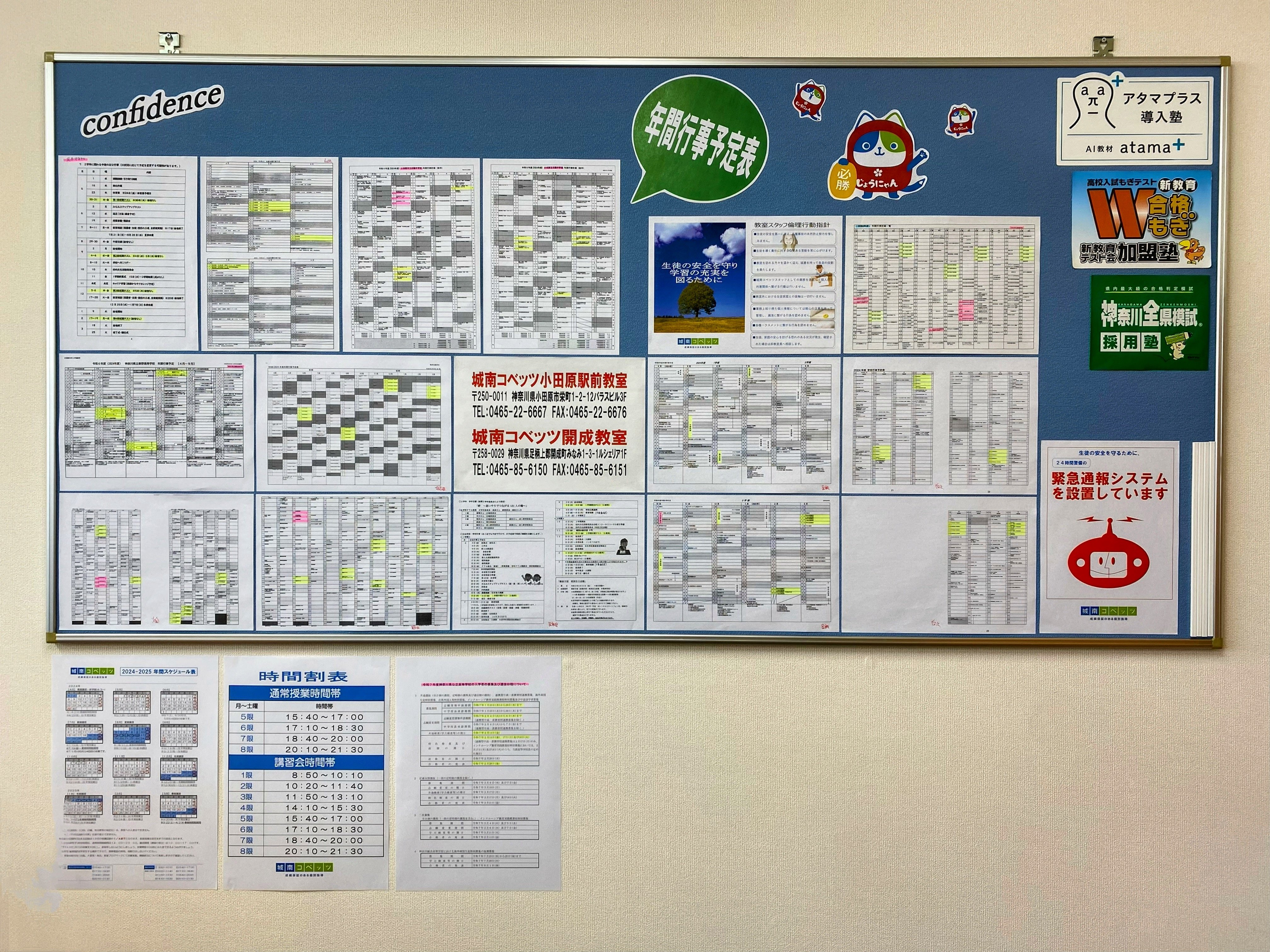 第1回定期テスト☆ 2024.05.24 どの学校も第1回定期テストまでカウントダウンが始まりました!開成教室ではテスト範囲を予想して学校よりも先に進める事を徹底しています。どの生徒もテスト範囲のテキストを2~3周して仕上げます☆テスト範囲を見ると結果へのヒントが見えます。やっぱり『学校ワーク』ですね♪学校ワークも授業で扱ったり宿題で出したり...何周も繰り返します!!全てできるようになるまで何周でも徹底します!!自習でも頑張っています♪『頑張るみんなを応援します!』今日も熱い授業で引っ張るよ!!!!!↑各学校の年間行事予定表です。これを確認して授業プランを考えます。