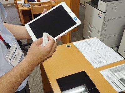 指導や説明で使用したタブレットは休み時間ごとに消毒します。