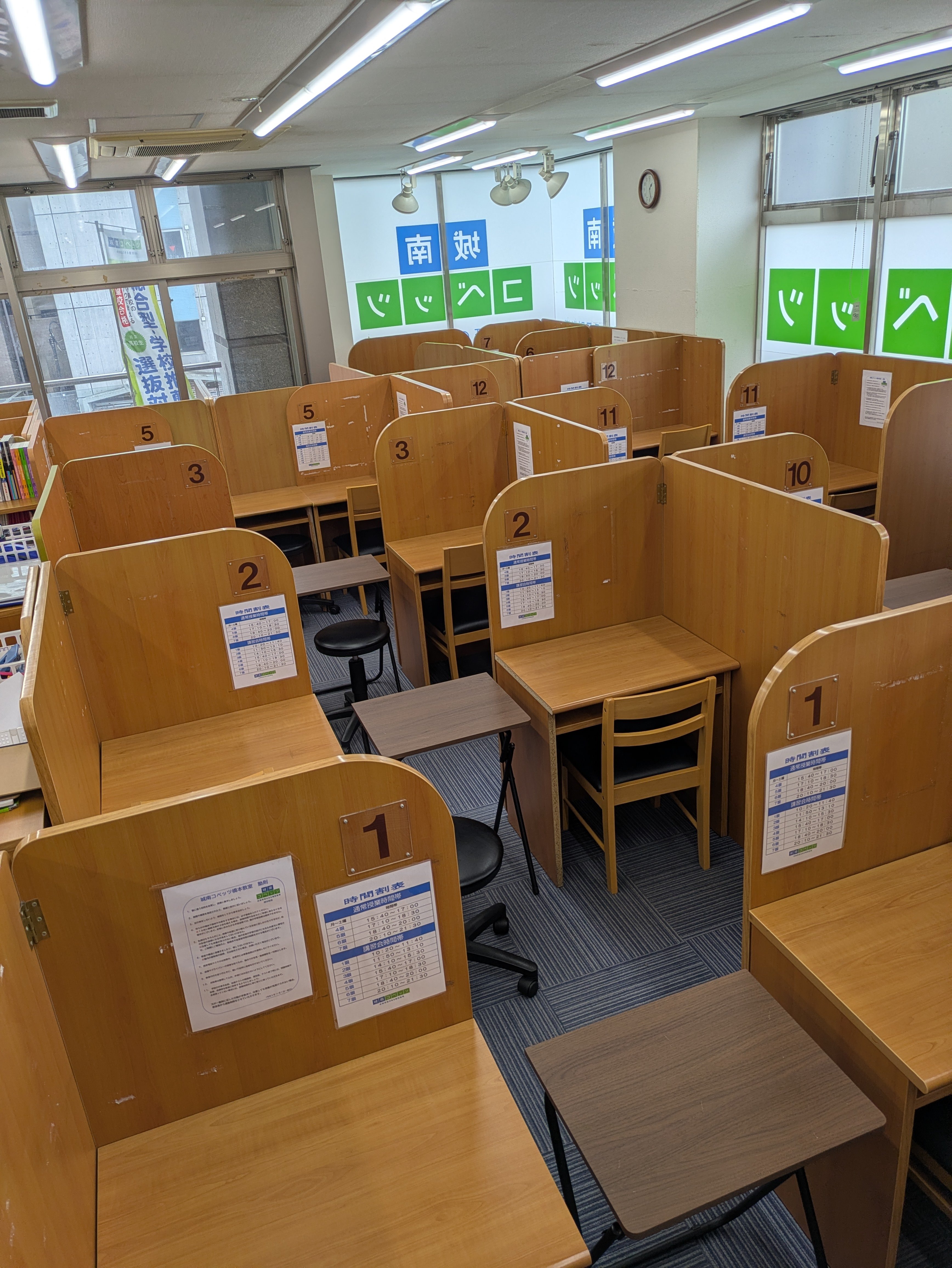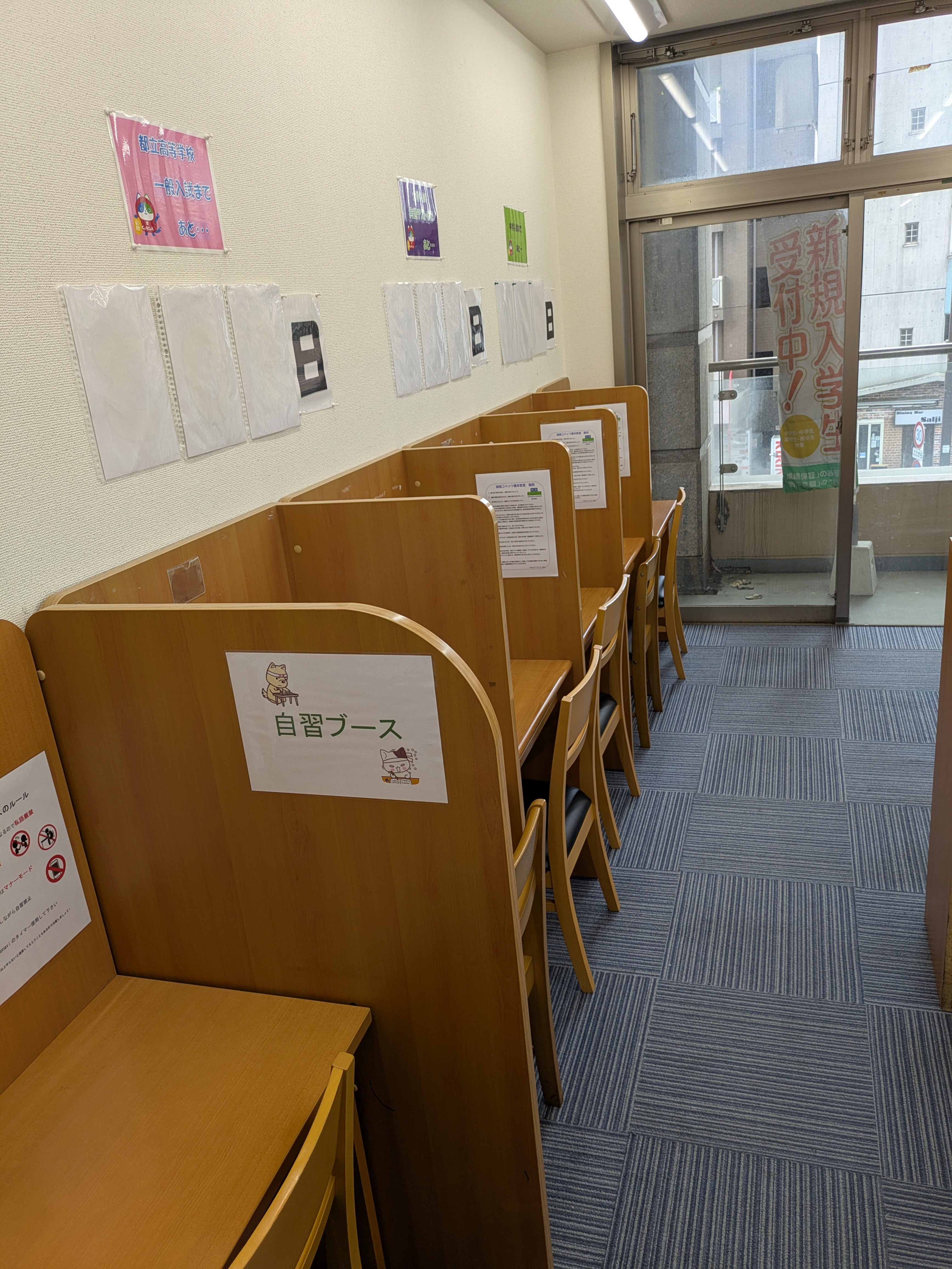 入口付近の座席表で自分の席を確認し、授業ブースへ移動します。