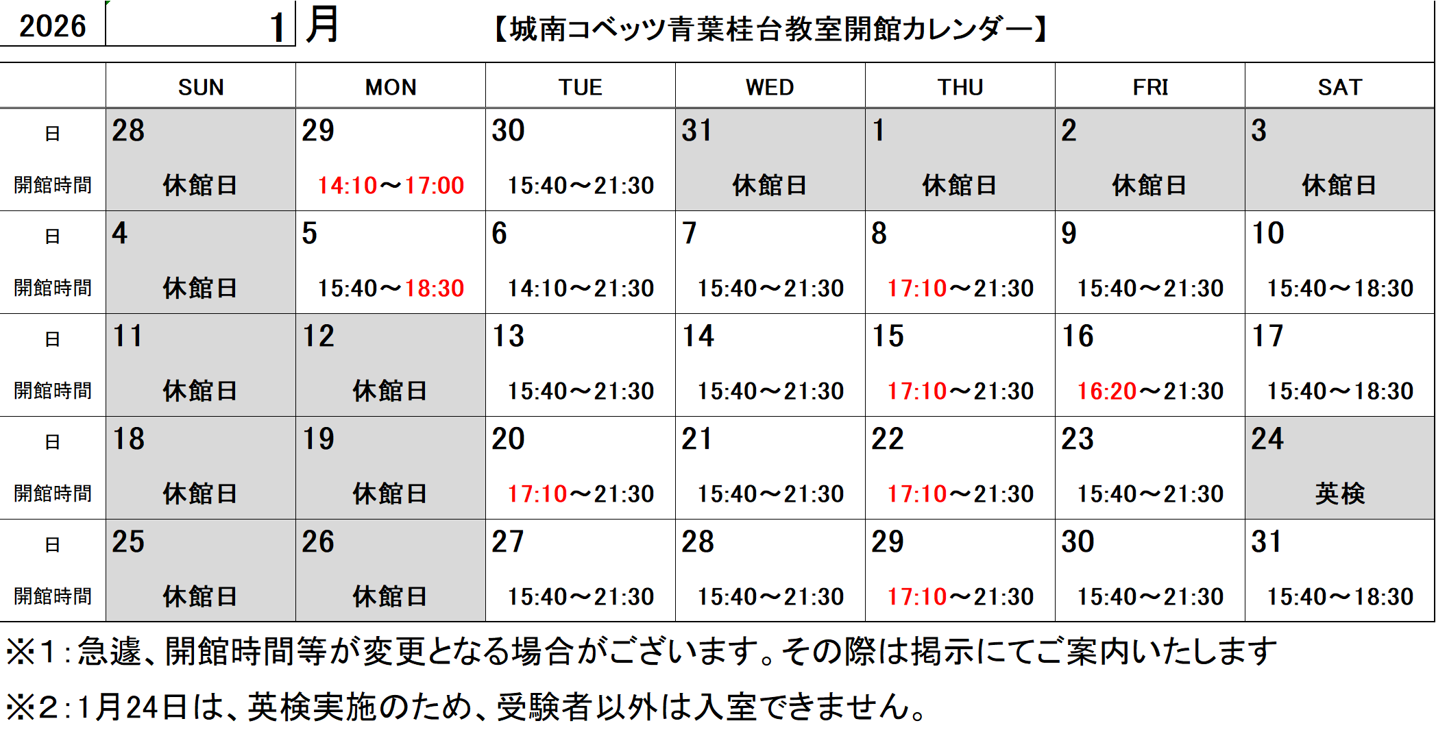 【1月受付時間】※休館日を除く火曜・水曜・金曜:15:30~20:00木曜:17:10〜20:00土曜:15:40~18:30【1月休館日】以下の日は教室への入室はできません。・日曜日・月曜日(1月5日除く)・1月24日(土)開館時間は、開館カレンダーをご参照ください。