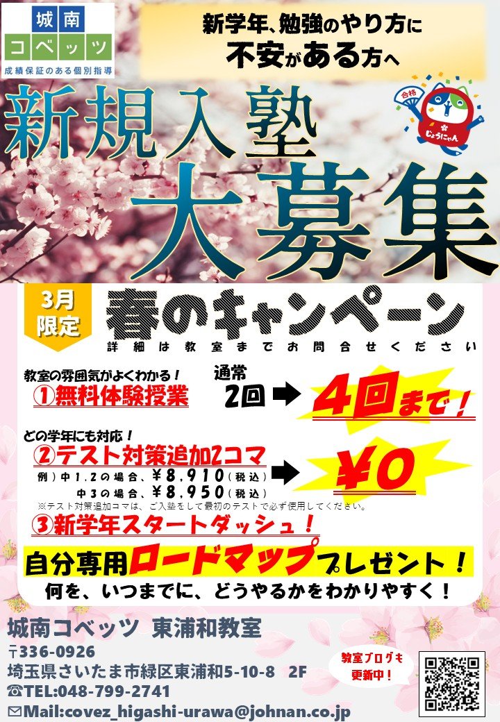 さて、城南コベッツ東浦和教室では、春期講習を絶賛受付中です!