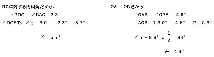 円周角の定理③(中3)を学ぼう 2025.03.17 3⃣ 円周角の定理と角の求め方 (例題)次の図で、∠ χ の大きさを求めなさい。 (解き方) (1)同じ弧に対する円周角を見つける。 (2)半径から二等辺三角形を見つける。