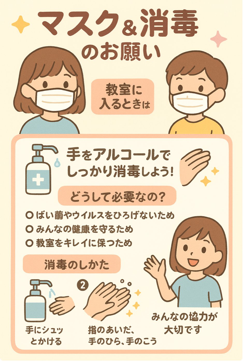 教室内での感染をできるだけしないように、お互いが気を付けて気持ち良く学習できる環境を作っていきましょう!