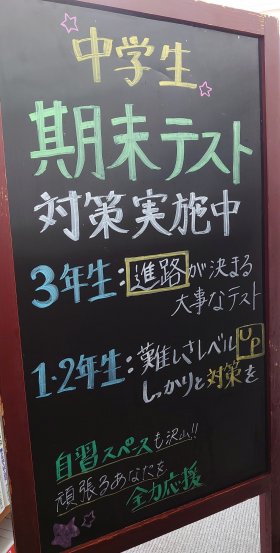 中学生2学期期末テスト対策実施中・日曜開館 2024.11.10 本日11月10日は日曜日で通常お休みですが、特別に開館しています。既に頑張っている生徒がいます。期末テストに向けて応援しています。対策プリントを用意してお待ちしています。城南コベッツ分倍河原教室はやる気のある生徒を全力で応援します!【新規入塾・冬期講習・テスト対策・受験対策受付中】城南コベッツ分倍河原教室電話:0120-59-0659メール:covez_bubaigawara@johnan.co.jp受付時間:14時30分~21時 日曜休館 (スーパーいなげやさんそば 教室の前に自転車が置けます)