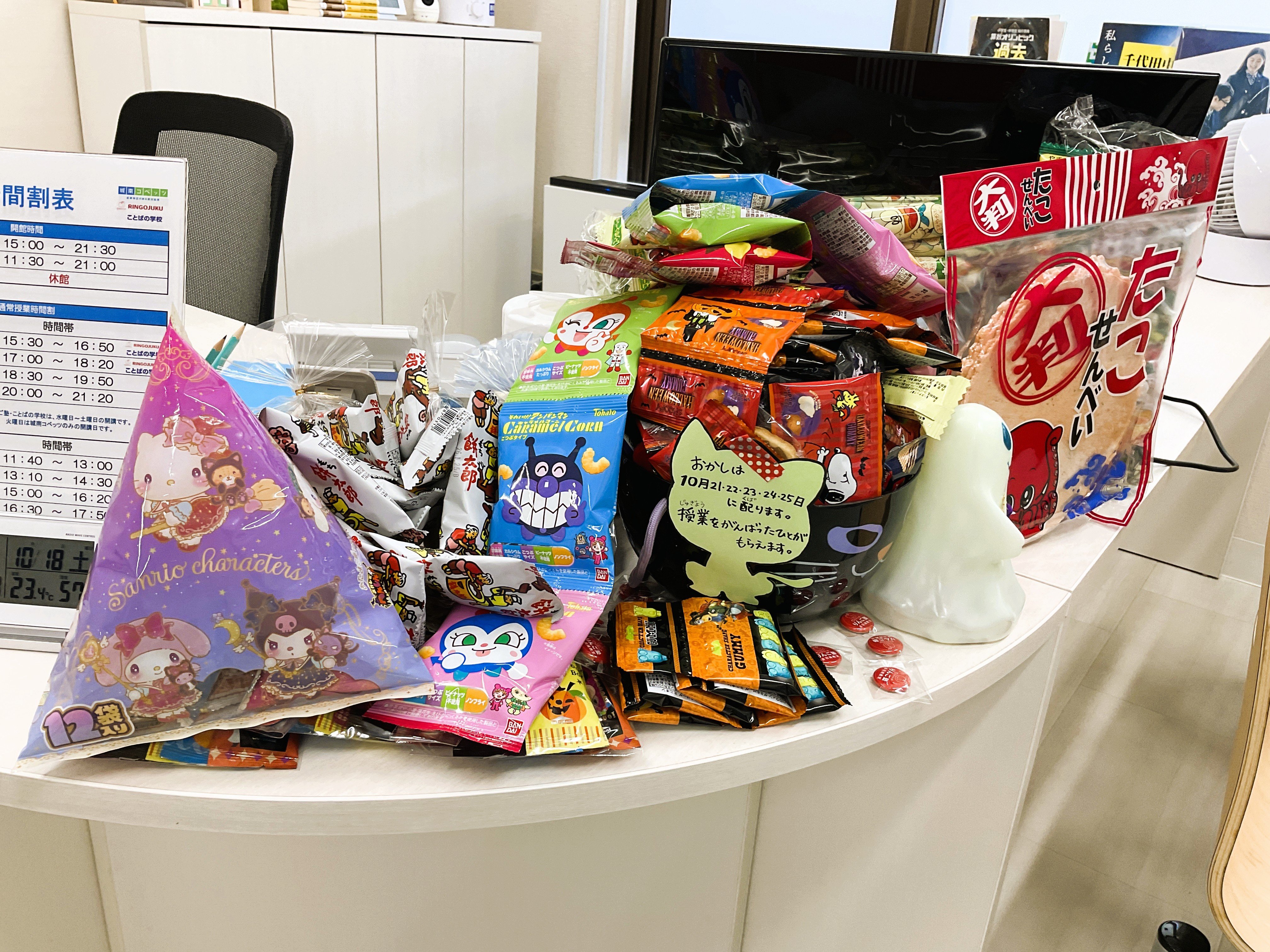 赤羽南教室の受け付けには子どもたちに配るお菓子がたくさん盛られています!
