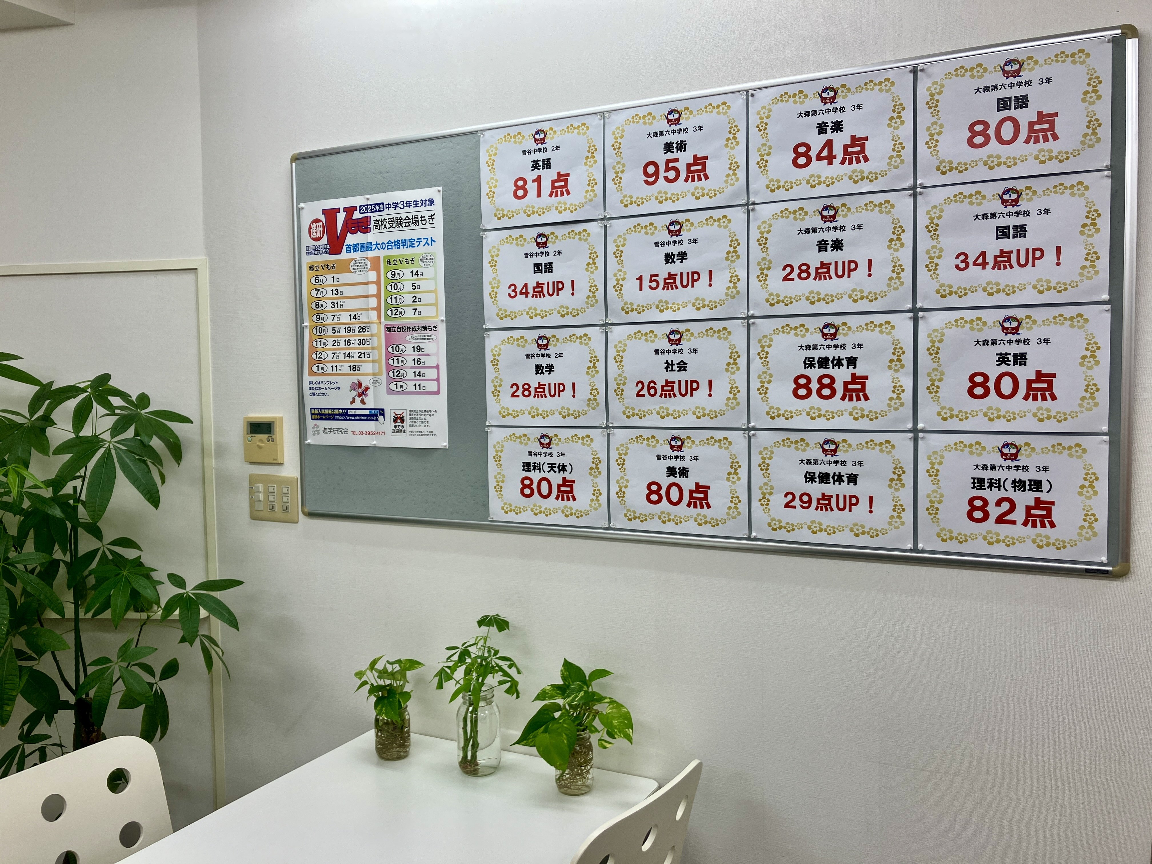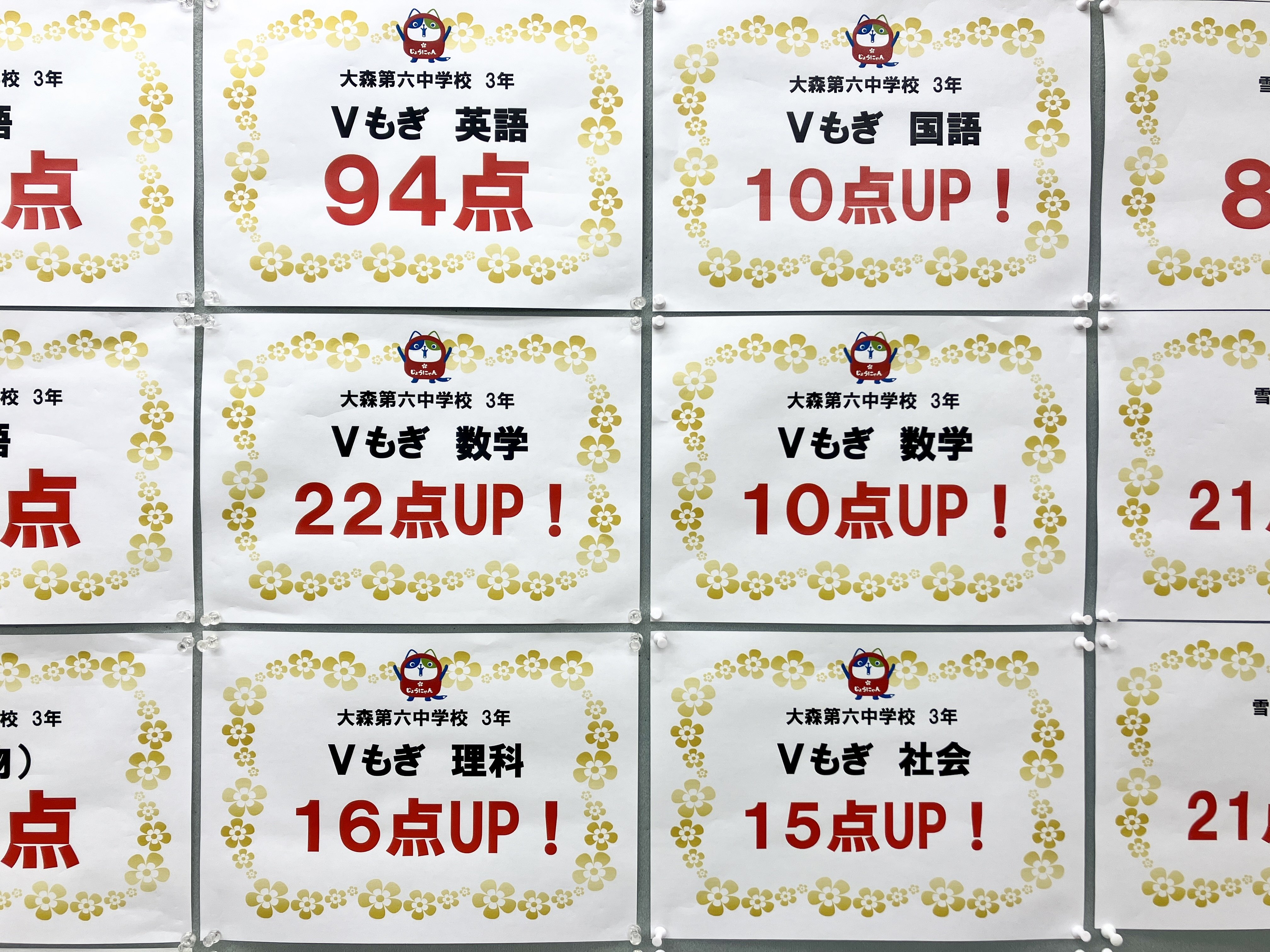 Vもぎ得点UP! 2025.10.24 いよいよ8月からVもぎの内容も、都立高校入試にそっくりなタイプの本格的なものになってきました。8月と9月の比較で高得点・得点UPを掲示して、生徒に祝福の声掛けをおこないました。夏の頑張りが反映されてよかったですね!