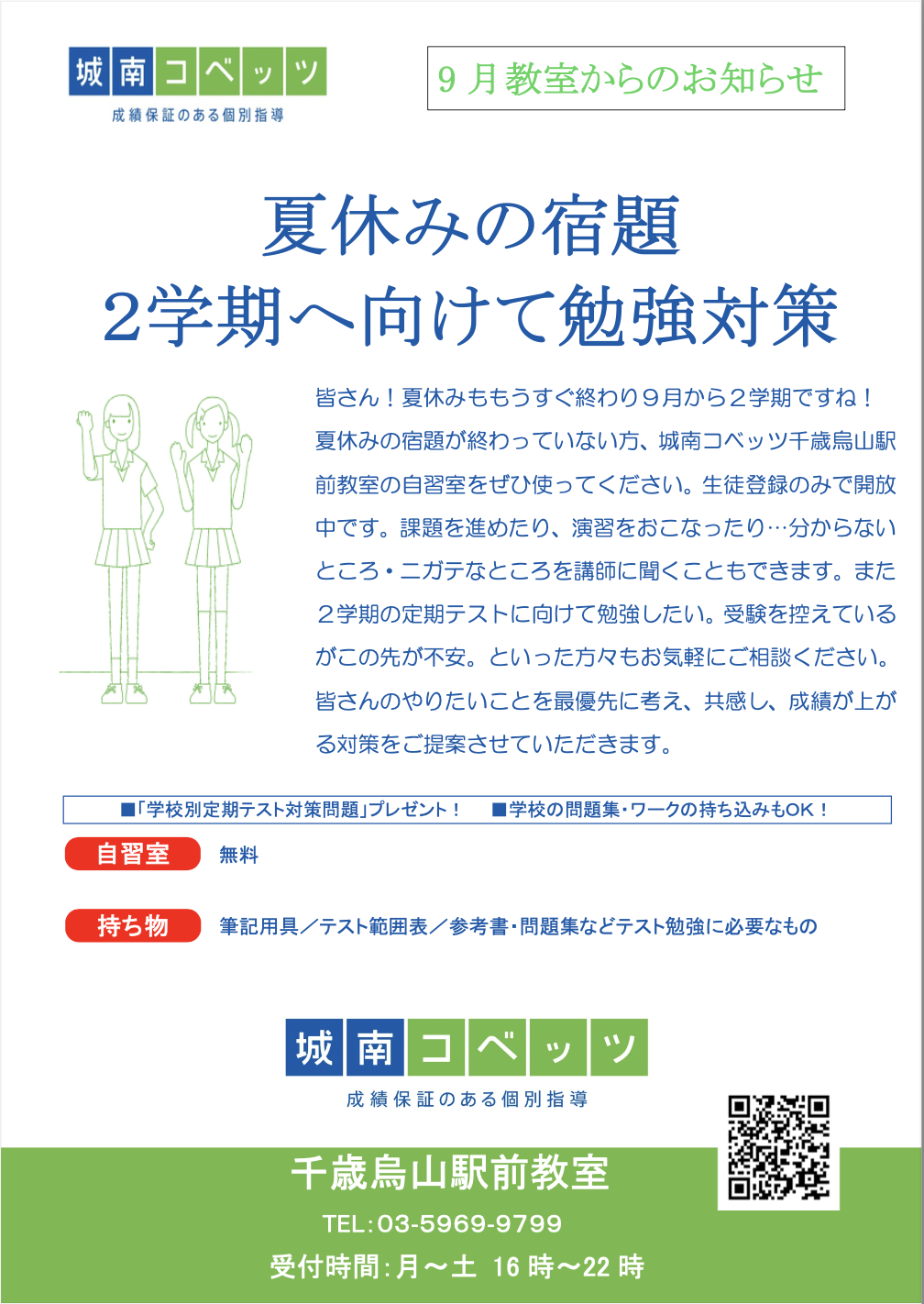 また今回惜しくも高得点には至らなかった生徒さんもいますが、今回の解き直しをしっかり行って次回の定期テストに向けて引き続き一緒に頑張っていきましょう! テスト結果が伸び悩んでいる皆さんへ!城南コベッツ千歳烏山駅前室では、生徒さん一人一人に合わせて点数アップにつながる指導を行っています!年末に入りますが、点数を伸ばしてしっかり定着させていきましょう! ぜひ一度城南コベッツ千歳烏山駅前教室にお問い合わせください! 城南コベッツ千歳烏山教室への資料請求はコチラをクリック! 無料体験授業のお申し込みはコチラをクリック! 千歳烏山駅前教室直通TEL 03-5969-9799 お問い合わせメールアドレスはこちらをクリック! 周辺校の生徒さんのサポートをしています! 世田谷区 上祖師谷中学校 烏山中学校 芦花中学校 千歳中学校 佼成学園女子中学校 成城学園中学校 調布第八中学校 船橋希望中学校 芦花小学校 烏山北小学校 烏山小学校 塚戸小学校 千歳台小学校 給田小学校 武蔵丘小学校 小学生 中学生 高校生 大学受験 個別指導 定期テスト AO入試 推薦 小論文 学習塾 学習習慣